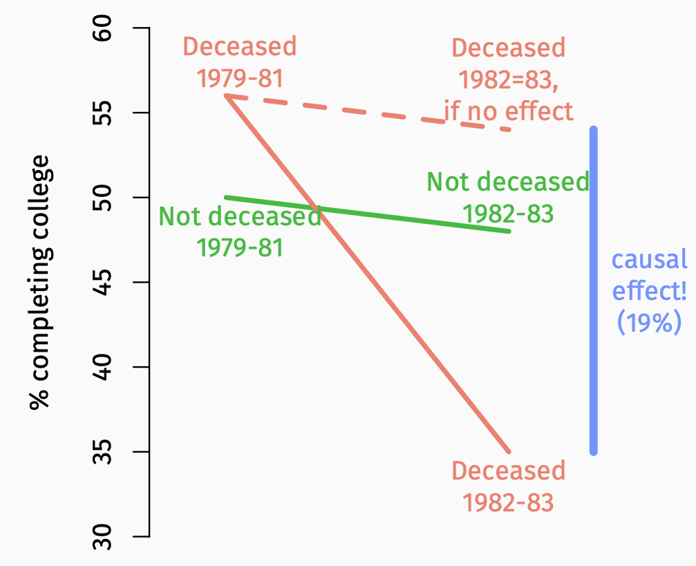 For white men, earnings in the 1980s were 15% lower in the treatment group; military service in Vietnam really did cause those serving to have less earning power long-term