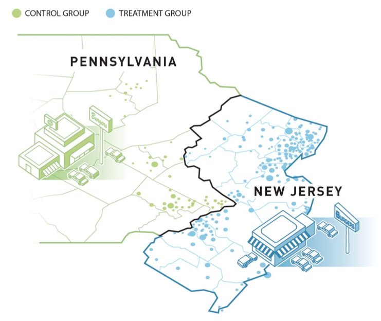 Researchers measured employment at 410 fast food restaurants in NJ and PA both before and after the change