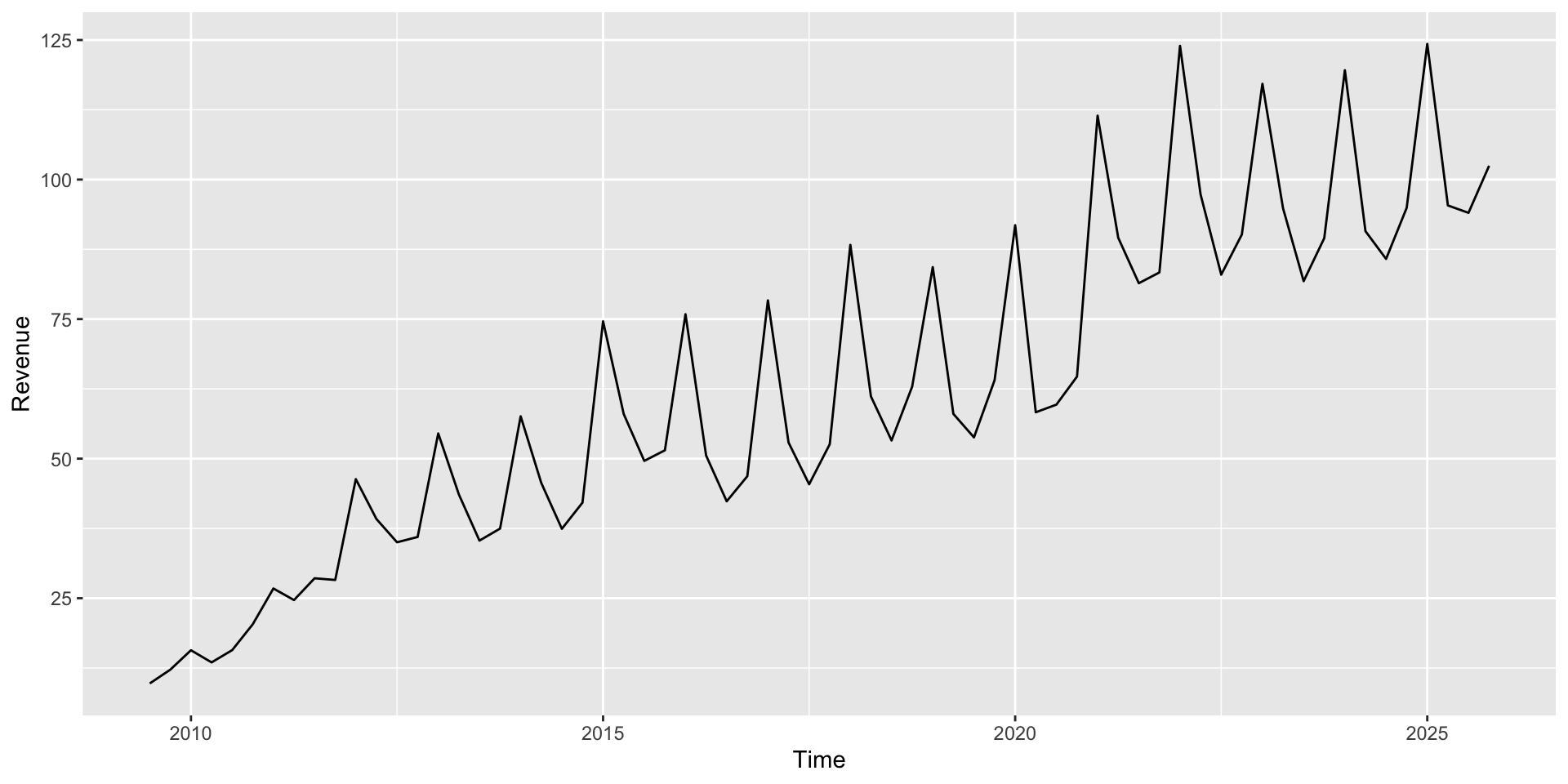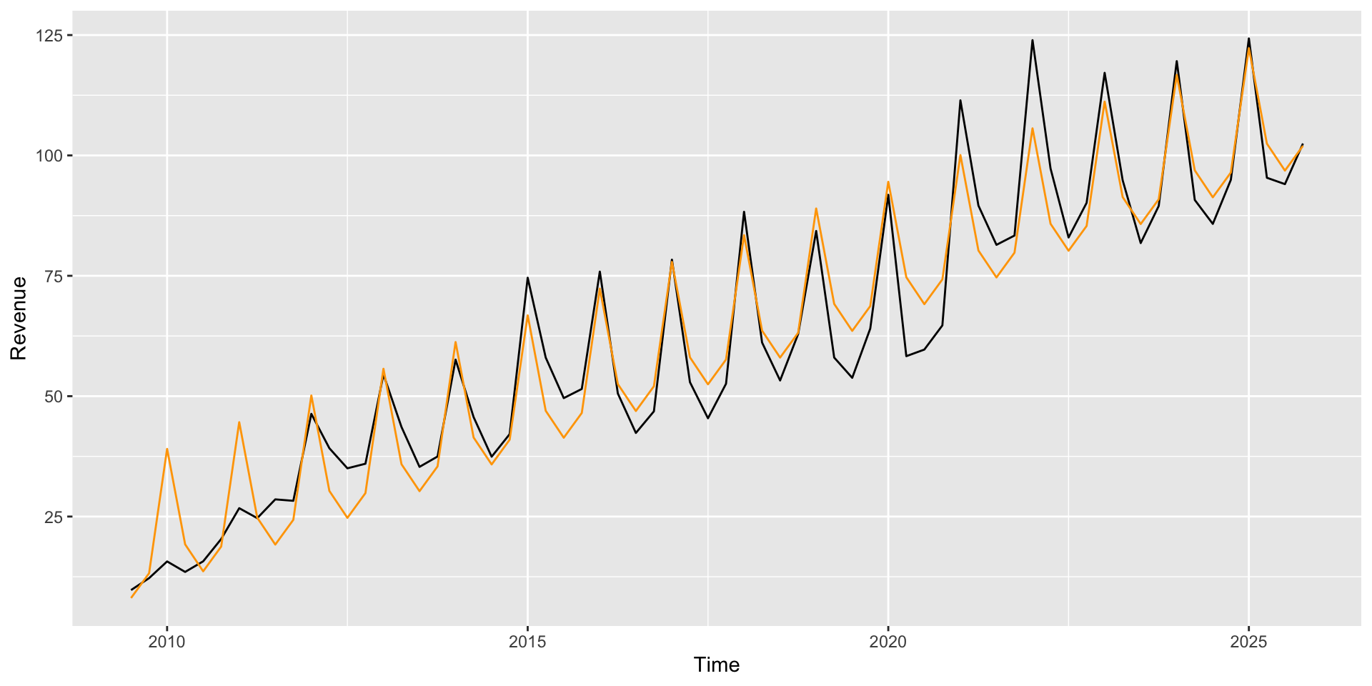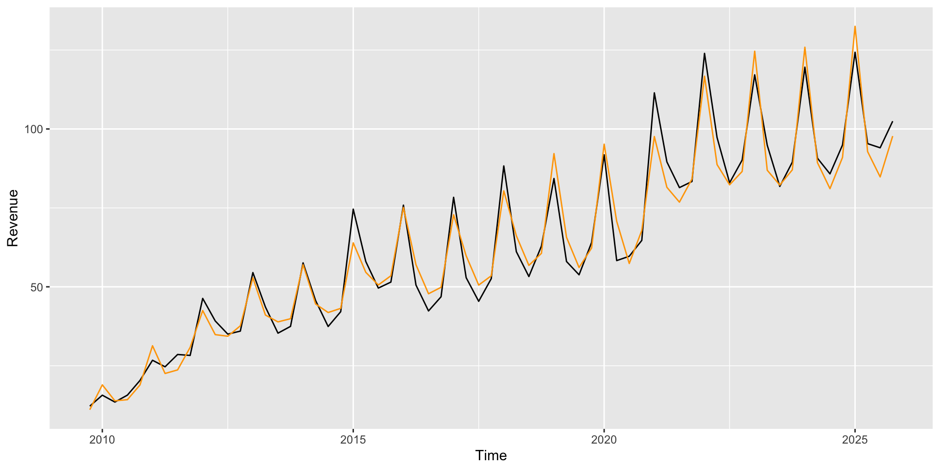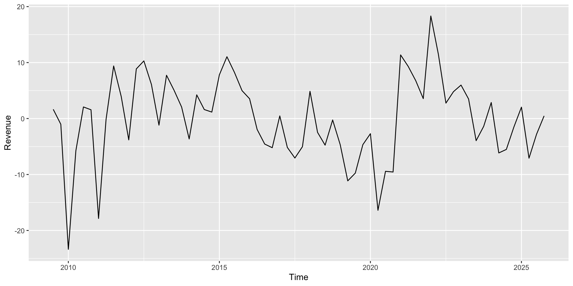 lag1.\[ \log(\texttt{Revenue}_t) = \log(\texttt{Period}_t) + \texttt{Quarter}_t + \log(\texttt{Revenue}_{t-1}) \]