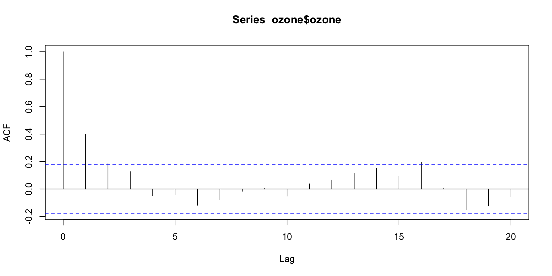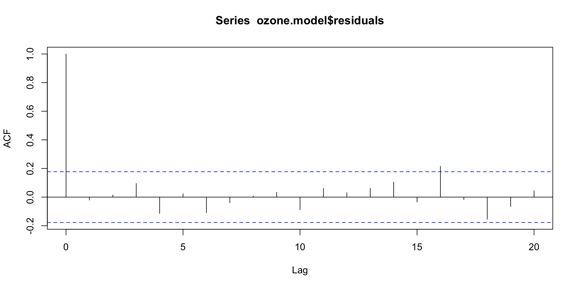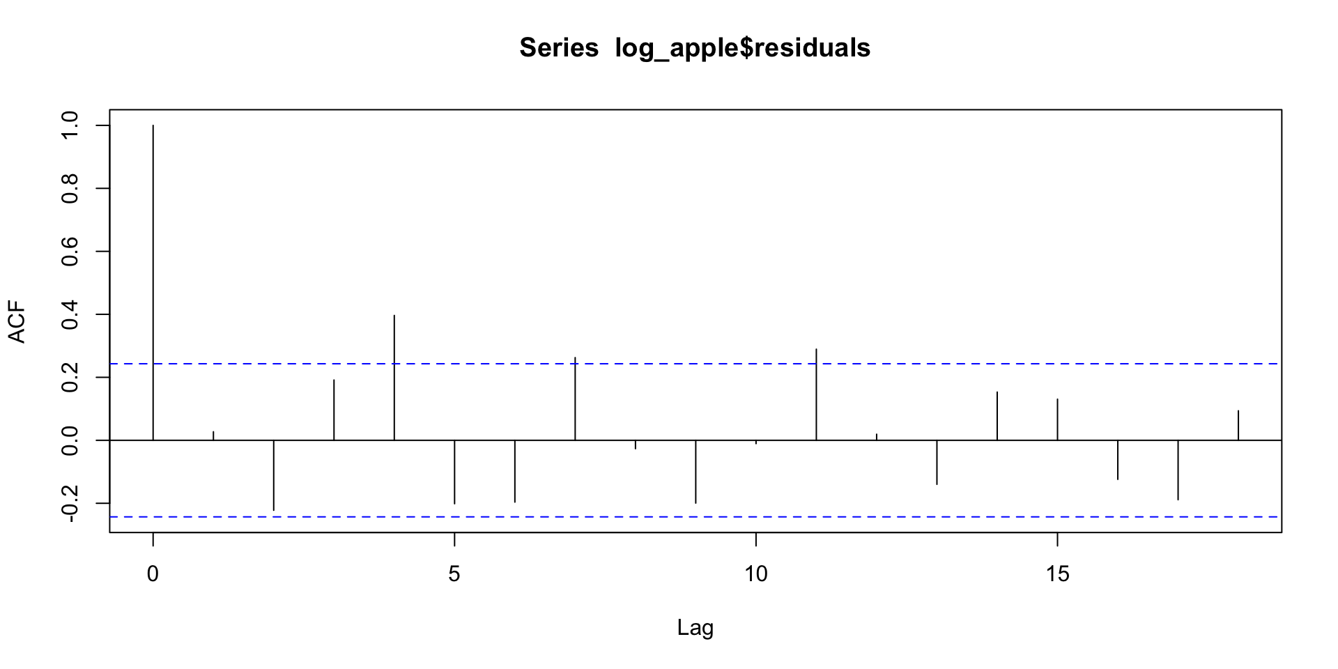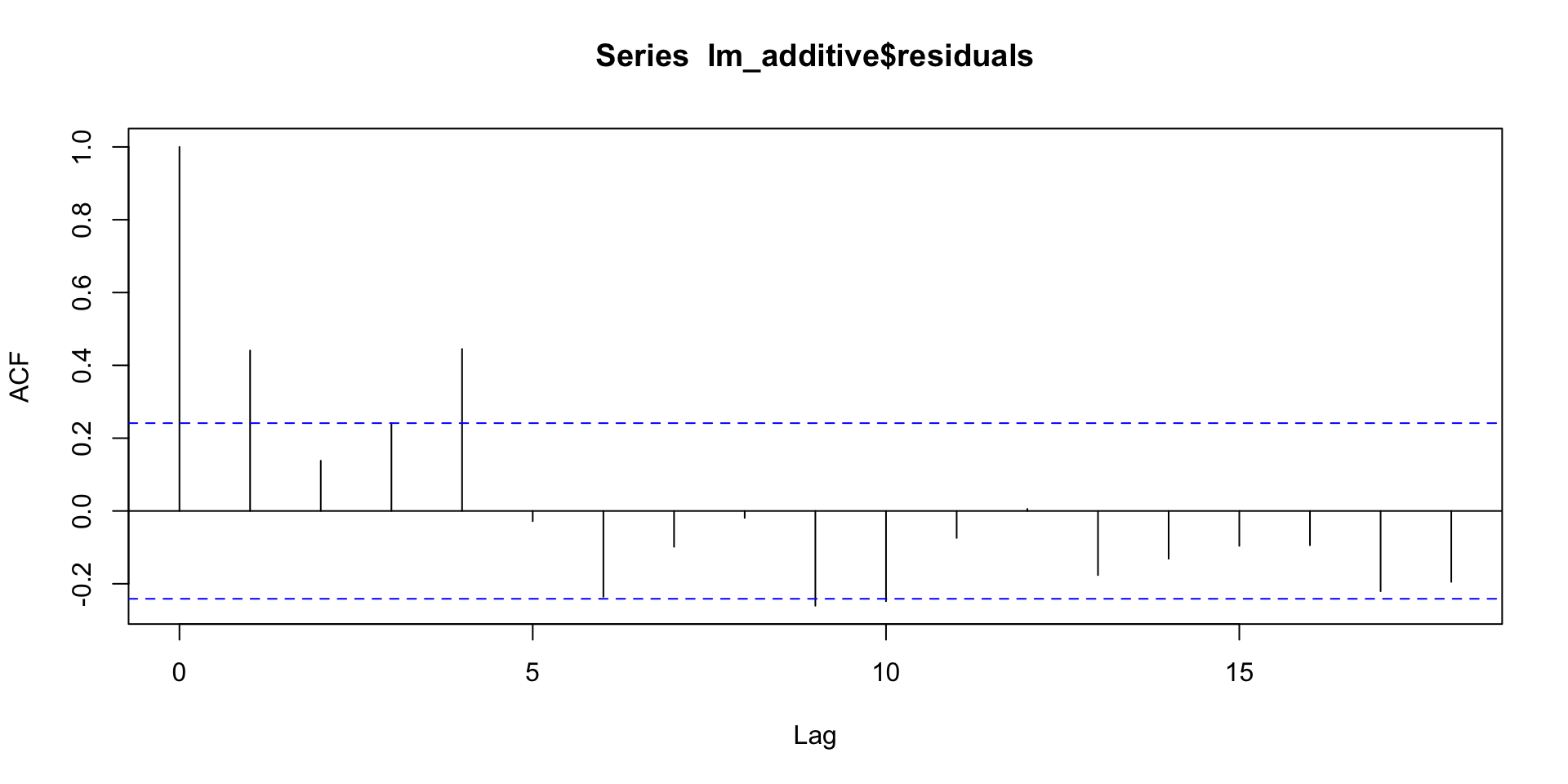 We also have the autocorrelation of the residuals, \(r_t\)’s, which indicates that there’s a strong indication that the independence assumption is violated \[ Cor(r_t, r_{t−1}), Cor(r_t, r_{t−2}),\dots \]